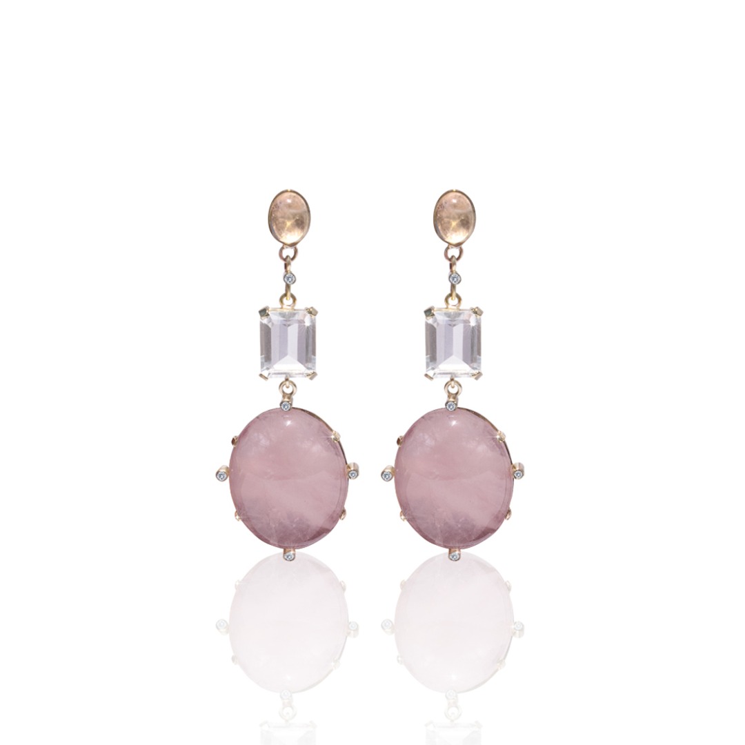 Aros de Oro Amarillo 18 K (Quilates) con gemas Luna, Cristal de Roca, Cuarzo Rosa Oval y Brillantes