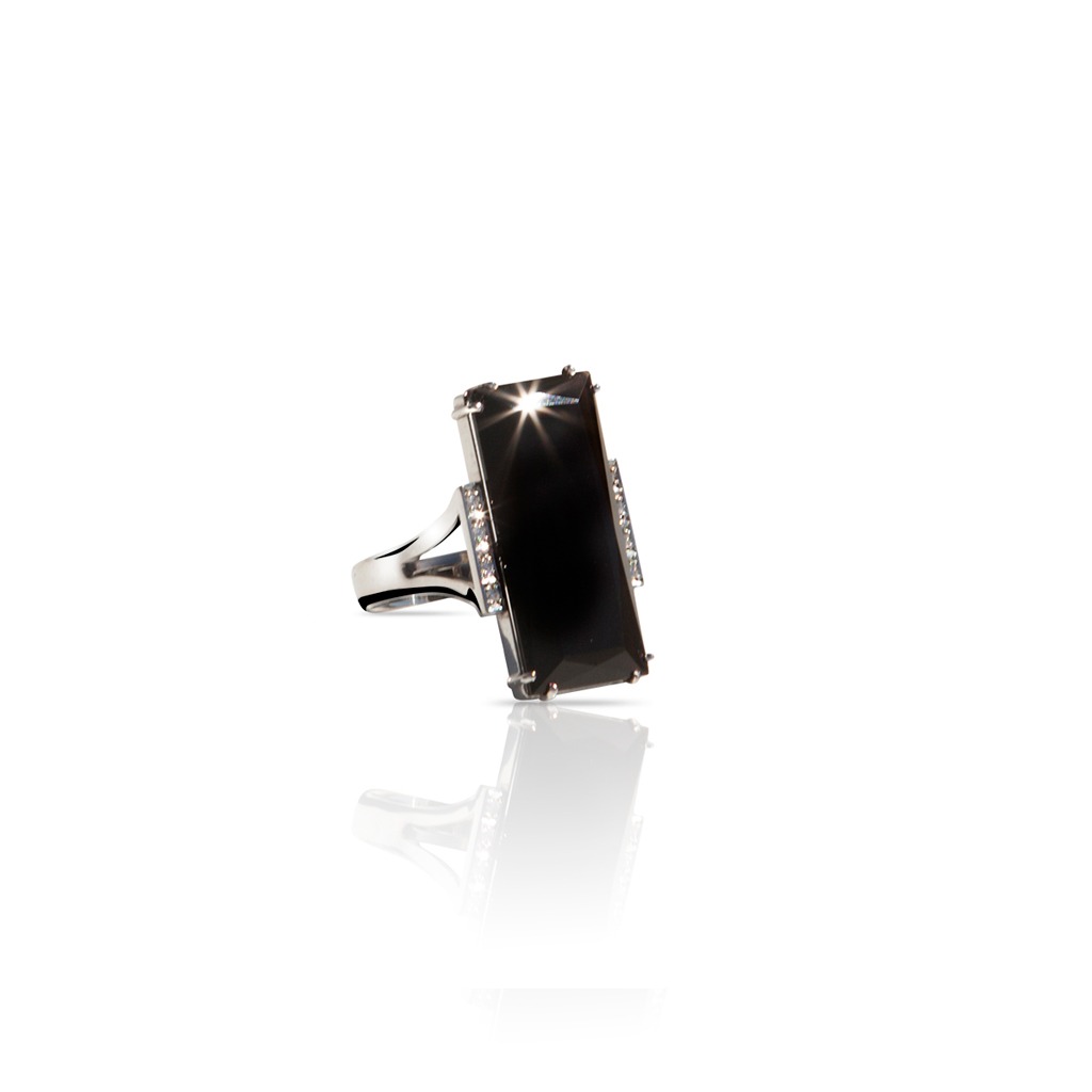 Anillo de Oro Blanco 18 K (Quilates) con Onix Negro en forma rectangular y Brillantes
