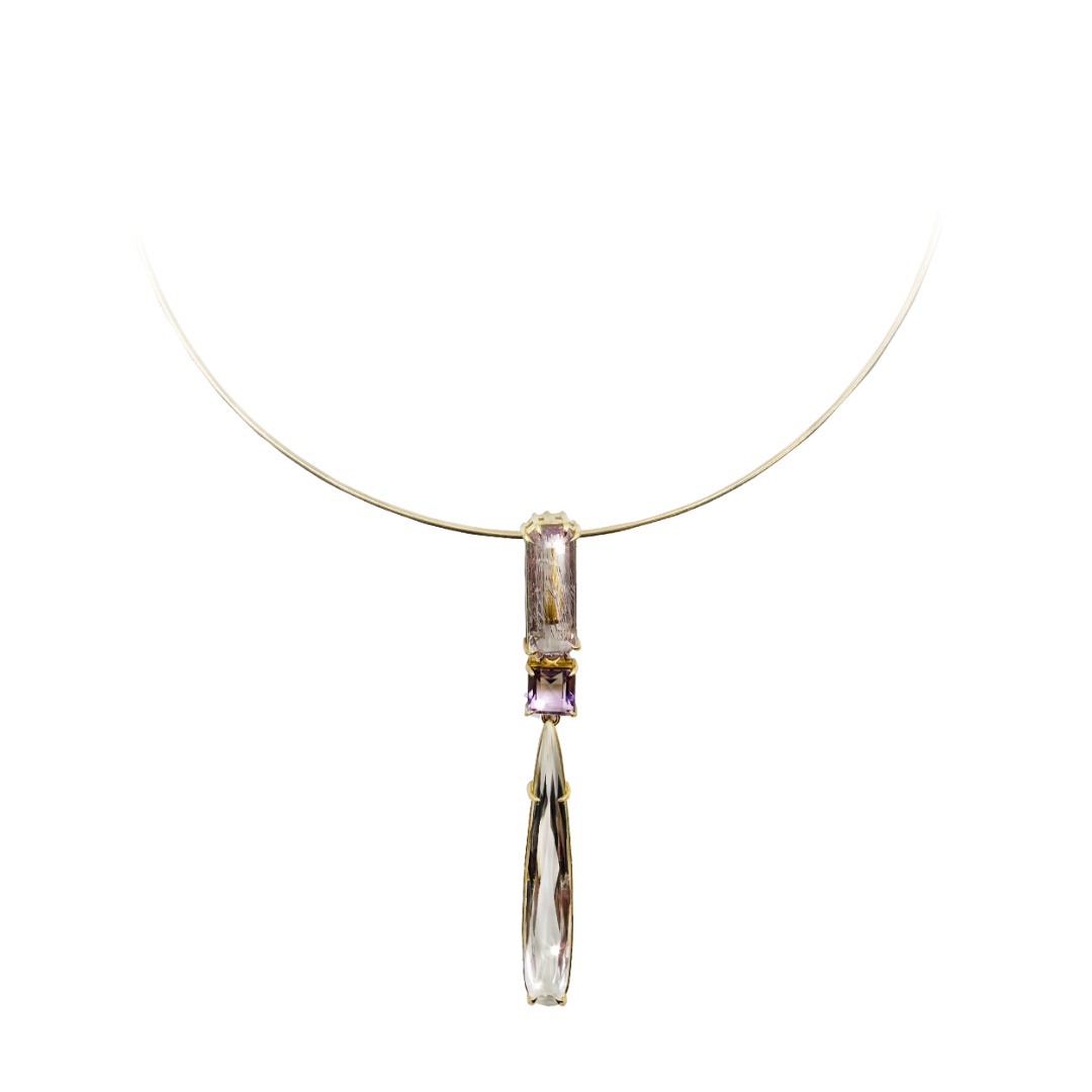 Collar de Oro amarillo 18K con gemas Kunzita, Ametistas y gota de Cristal de Roca