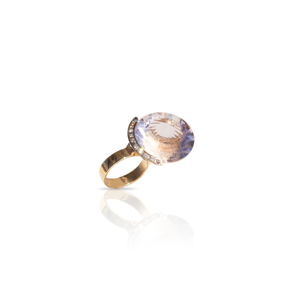 Anillo de Oro Amarillo 18 K (Quilates) con Ametista en forma de cono, envuelta en Oro Blanco con Brillantes